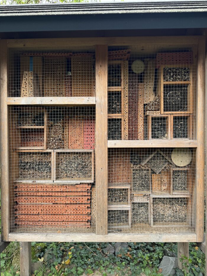 Also, grundsätzlich sagt man ja lieber viele kleine Insektenhäuser als ein großes … die großen Insektenhäuers, wie unseres in Kants Garten z.B. sind aber in öffentlichen Anlagen oder wegen des „Lehr-Aspektes“ auch sinnvoll. Und gepaart soll ein solches Wildbienenhaus natürlich mit einer möglichst insektenfreundlichen Bepflanzung sein, die über viele Monate blüht, also Pollen und Nektar bietet.